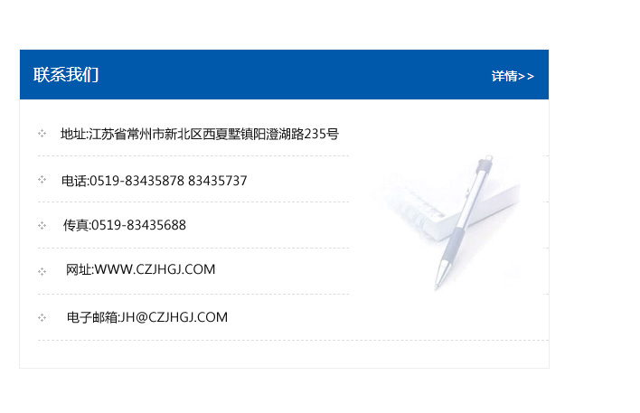 地址:常州市新北區友邦商務大廈1幢16、17層  電話:0519-85101652  傳真:0519-85112595  郵編:213022  網址:www.cz-jiayue_cn.jhzqyz.com  郵箱:xiajifengaa@163.com